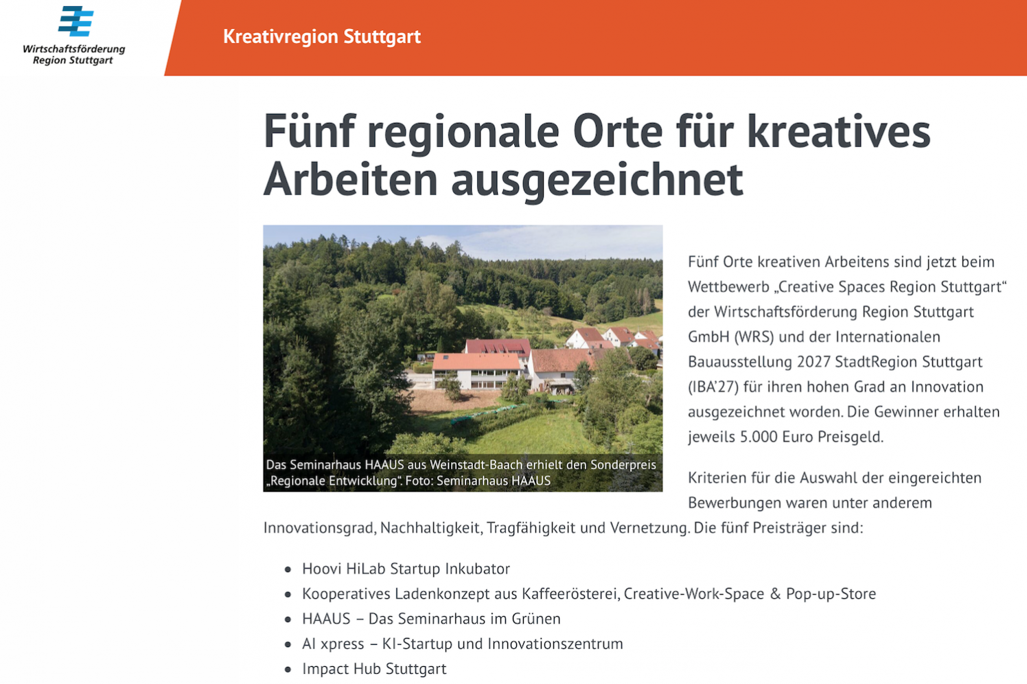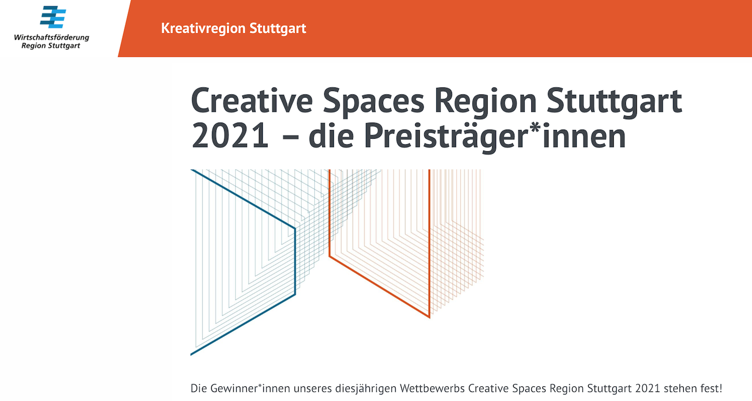Mit dem Wettbewerb „Creative Spaces Region Stuttgart“ zeichnet die Wirtschaftsförderung Region Stuttgart GmbH (WRS) zusammen mit der Internationalen Bauausstellung 2027 StadtRegion Stuttgart (IBA’27) neue Konzepte für kreativwirtschaftliche Orte in der Region Stuttgart aus. Unterstützt werden innovative und nachhaltige Entwürfe für Orte kreativen Arbeitens.